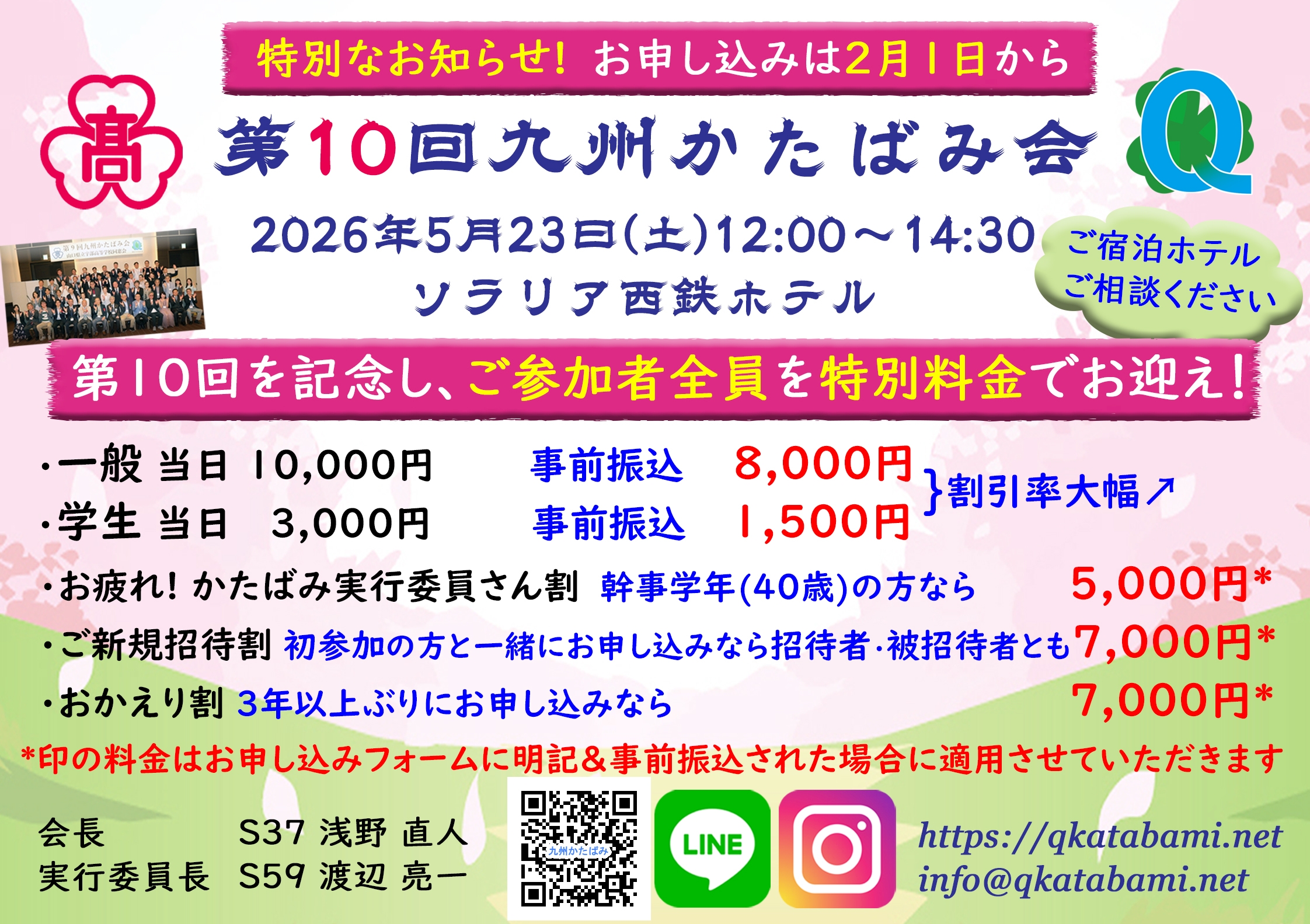 第10回記念となる九州かたばみ会のご案内です。今年も卒業の期を越えて同窓生が楽しく交流できる会にしたいと考えております。福岡、九州各県はもちろん、宇部、東京など遠方の皆様もぜひご参加ください。