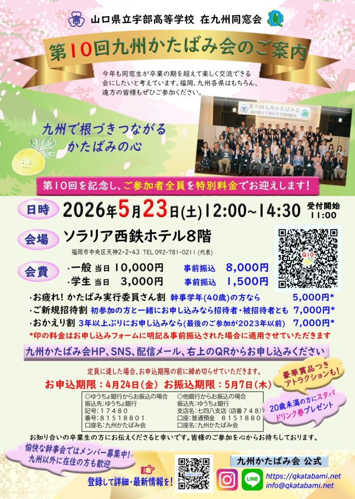 第10回記念となる九州かたばみ会のご案内です。今年も卒業の期を越えて同窓生が楽しく交流できる会にしたいと考えております。福岡、九州各県はもちろん、宇部、東京など遠方の皆様もぜひご参加ください。